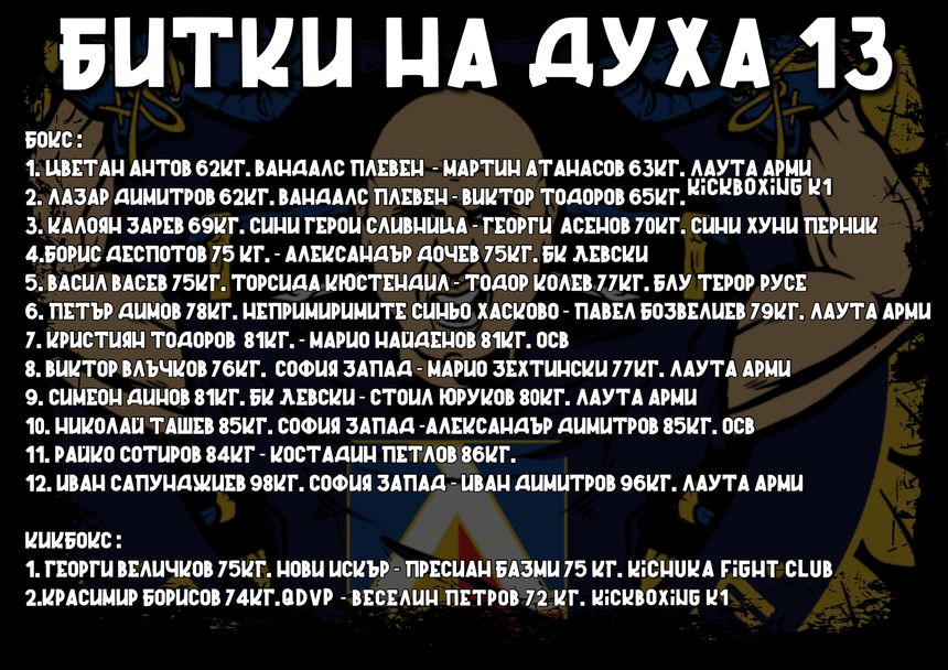 С исторически триумф за световна титла на Мартин Копривленски, победа с нокаут на Симеон Наковски и куп зрелищни боксови и кикбоксови битки при любителите премина 13-тото издание на "Битки на духа", което Sportal.bg излъчи на живо от столичната зала "Христо Ботев". Организаторите от национален фенклуб на привържениците на Левски и Българска федерация по бокс бяха подготвили богата програма от битки на любители от различни боксови клубове в страната, а гвоздеят на събитието станаха двата двубоя на едни от най-прогресиращите професионалисти в кикбокса - Мартин Копривленски и Симеон Наковски.