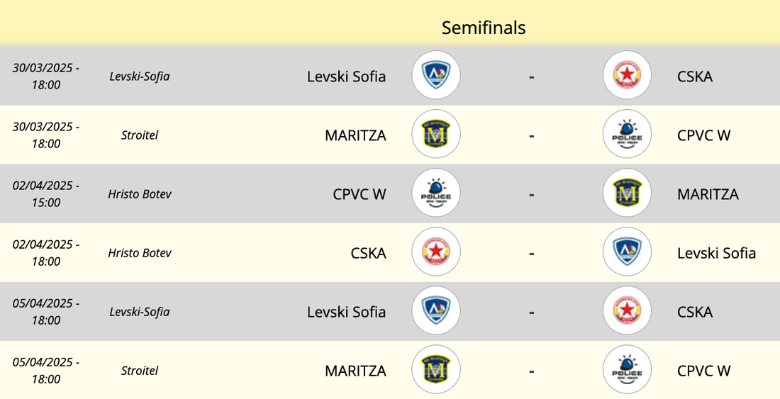 В другия полуфинален сблъсък един срещу друг ще се изправят Левски (София) и ЦСКА (София). Вечното дерби започва с домакинство на „сините“, а двубоят е тази вечер от 18:00 часа в зала „Левски София“.