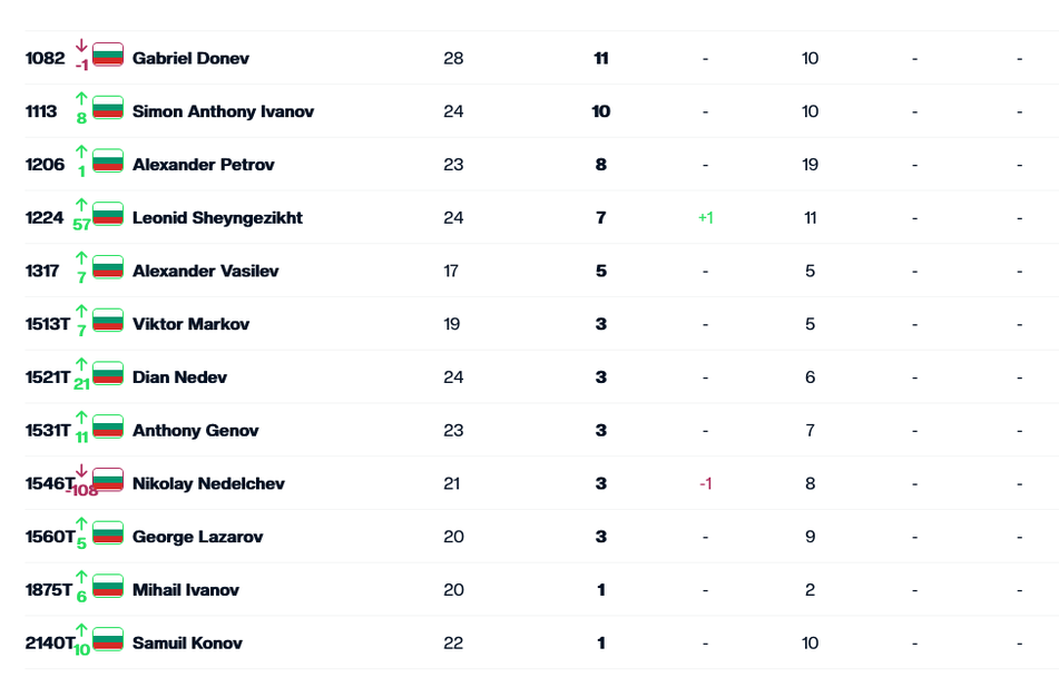 Димитър Кузманов е под №278 (+1) със 190 пункта, а Пьотр Нестеров се изкачи с 5 позиции до №443 със 104 точки.