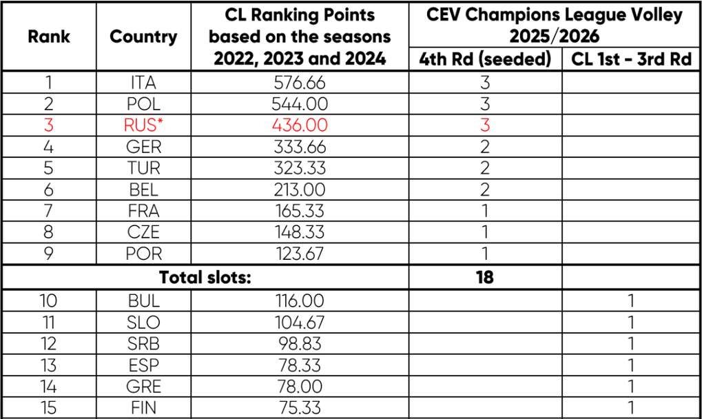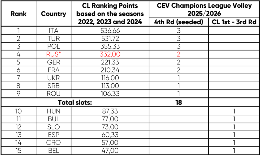 България ще има по един отбор в груповата фаза на Шампионската лига по волейбол и при мъжете, и при жените и през новия сезон. Това стана ясно, след като Европейската конфедерация по волейбол (CEV) обяви ранглистата по нации.