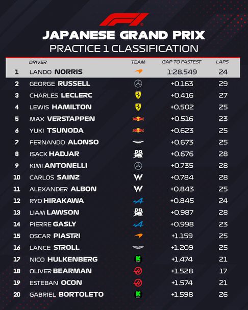 Зад Цунода челната десетка в първата тренировка в Страната на изгряващото слънце оформиха Фернандо Алонсо, Исак Хаджар, Андреа Кими Атнонели и Карлос Сайнц. Лиам Лоусън се нареди на 13-та позиция, изоставайки с 0.311 от съотборника си в Рейсинг Булс Хаджар.