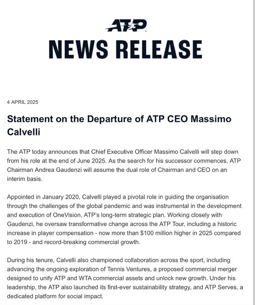Председателят на Асоциацията на професионалните тенисисти (ATП) Андреа Гауденци ще добави ролята на главен изпълнителен директор към задълженията си на временна основа, след като настоящият главен изпълнителен директор Масимо Калвели напусне поста в края на юни и започне търсенето на негов наследник.