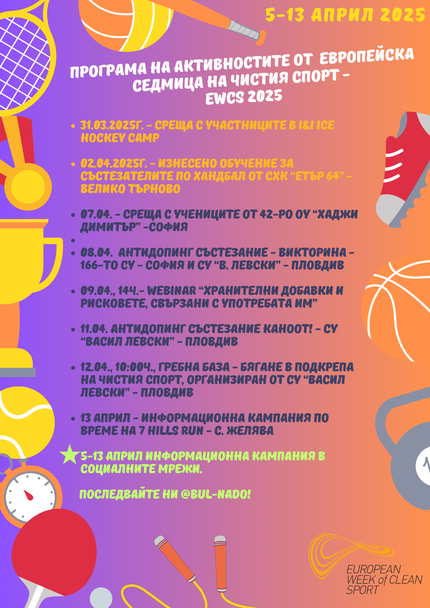 Официално "Европейска седмица на чистия спорт" стартира на 5 април с кампания в социалните мрежи, която има за цел повишаване на информираността на спортната общност относно антидопинговите дейности. Програмата на EWCS включва разнообразни активности както за спортисти, така и за ученици и спортуващи в свободното време.