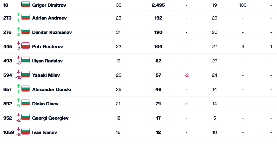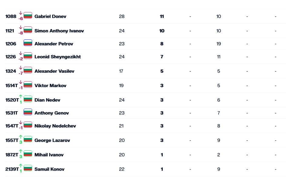 За съжаление следващите трима българи в класацията записаха отстъпление. Пьотр Нестеров падна с две места до №445 със 104 точки, Илиян Радулов загуби три позиции и вече е №493 с 82 точки, а Янаки Милев отстъпи с 10 места до №594 с актив от 57 точки.