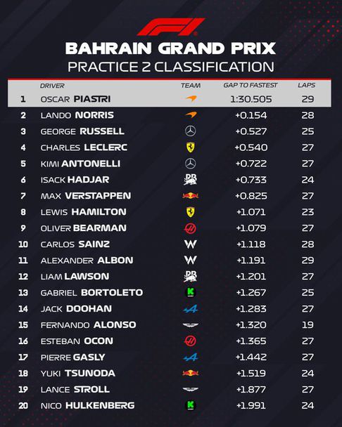 Пилотът на Макларън Оскар Пиастри оглави класирането в края на втората свободна тренировка преди надпреварата за Гран При на Бахрейн, в която той и съотборникът му Ландо Норис имаха категорично предимство пред останалите пилоти.