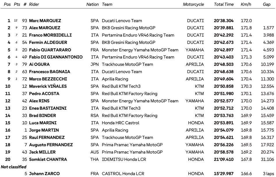 След това пилотът на Дукати не даде шанс на брат си дори да си помисли да го атакува втори път и спечели с аванс от 1.5 секунди. Алекс Маркес финишира втори, за да запише седмата си поредна втора позиция от началото на сезона. Тройката допълни Франко Морбидели, който още в началото на втората обиколка изпревари Фабио Куартараро, но в края трябваше да се отбранява от бившия си съотборник, който беше много бърз.