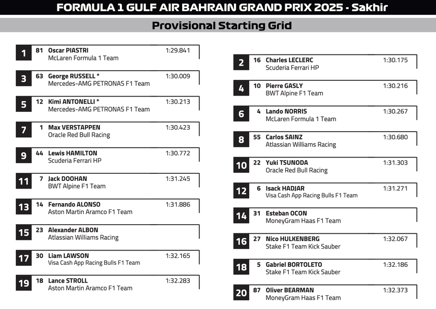 До австралиеца на първата редица трябваше да застане Джордж Ръсел, но пилотът на Мерцедес и неговият съотборник Андреа Кими Антонели бяха наказани с по една позиция след квалификацията снощи. Така от второто място ще стартира Шарл Леклер, а Ръсел ще потегли трети пред Пиер Гасли и Антонели, които ще тръгнат четвърти и пети.