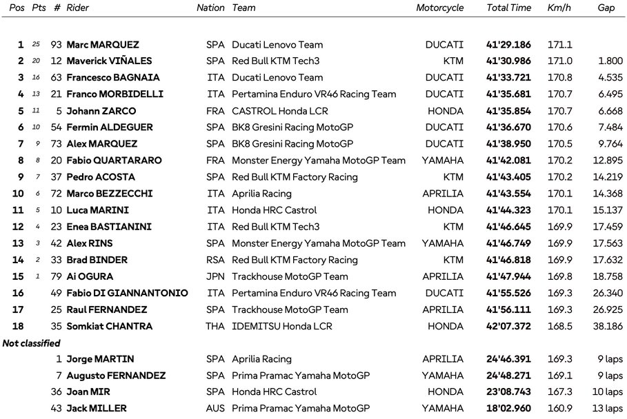 До финала Винялес не можа да се доближи повторно до Маркес и завърши на второто място, на 1.8 секунди зад него. За Винялес този подиум идва напълно изненадващо на фона на неговите резултати от началото на сезона. В първите три кръга пилотът на Tech3 КТМ нямаше нито едно влизане в топ 10 в състезанията или спринтовете.