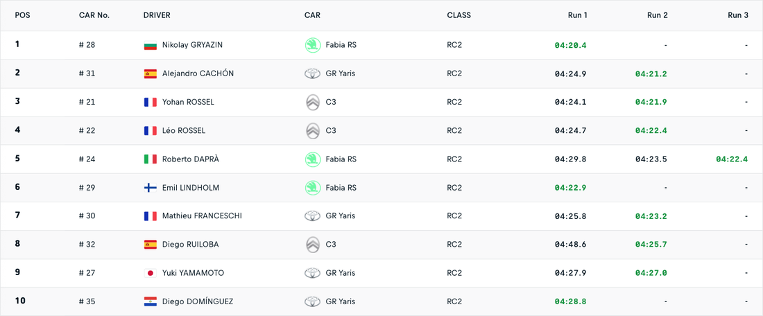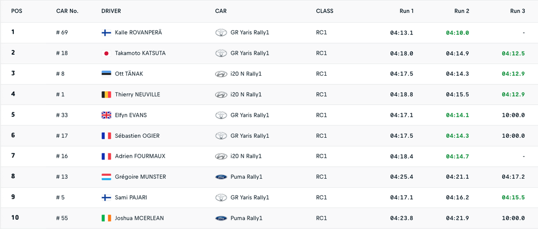 Единственият пилот в Rally1, който има победа на Канарските осторови – Адриен Фурмо се нареди седми в шейкдауна с пасив от 4.7 спрямо Рованпера със своето време от второто си минаване. Челната десетка оформиха Сами Паяри (4:15.5), Грегоар Мюнстер (4:17.2) и Джошуа Макърлийн (4:17.9).