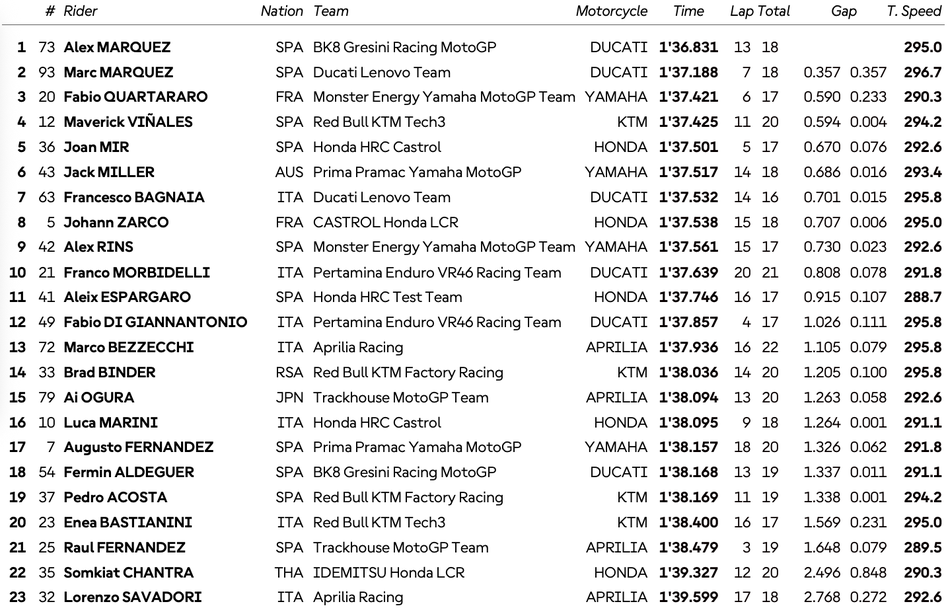 Важно е да се отбележи, че по-малкият от братята Маркес сложи нови гуми в края на тренировката, което обяснява и причината за повишаването на неговото темпо. А причината той да стори това беше падането, което регистрира в първия завой 18 минути преди края на тренировката и нуждата да използва втория си мотор.