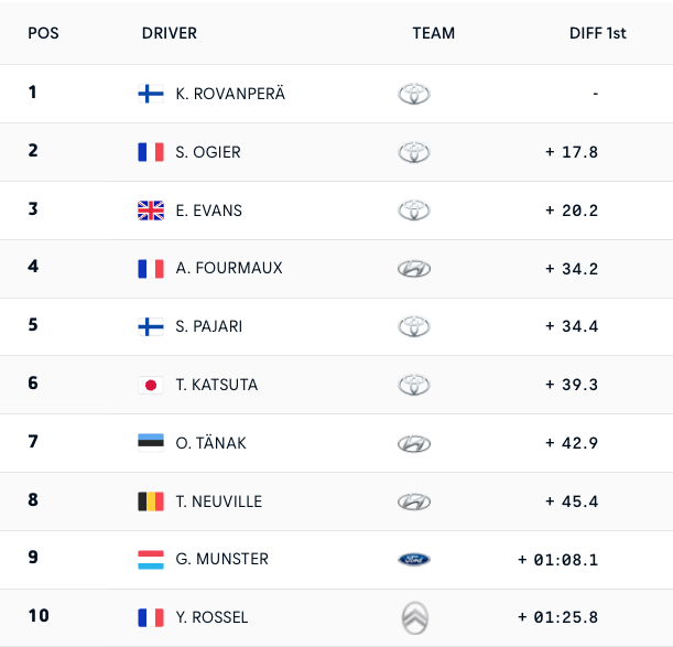Пред двамата са Сами Паяри и Такамото Кацута, които се движат с пасив от съответно 34.4 и 39.3 от първото място. Грегоар Мюнстер се движи девети на 1:08.1 от Рованпера, а топ 10 оформя лидерът в WRC2 Йоан Росел, който има пасив от 1:25.8 от първото място. Французинът води с 20.0 пред брат си Лео в битката за победата в WRC2, а топ 3 с пасив от 21.4 спрямо лидера оформя българския пилот Николай Грязин.