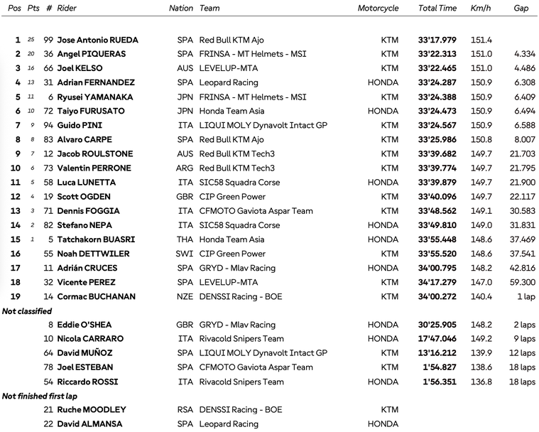 В генералното класиране със своята трета победа от пет старта за сезона Руеда си връща първата позизия. Испанецът оглавява подреждането с актив от 91 точки и аванс от 4 пред Пикерас, който спечели двете състезания, които Руеда не успя. Тройката с пасив от 34 пункта спрямо лидера оформя третият от днес Келсо.