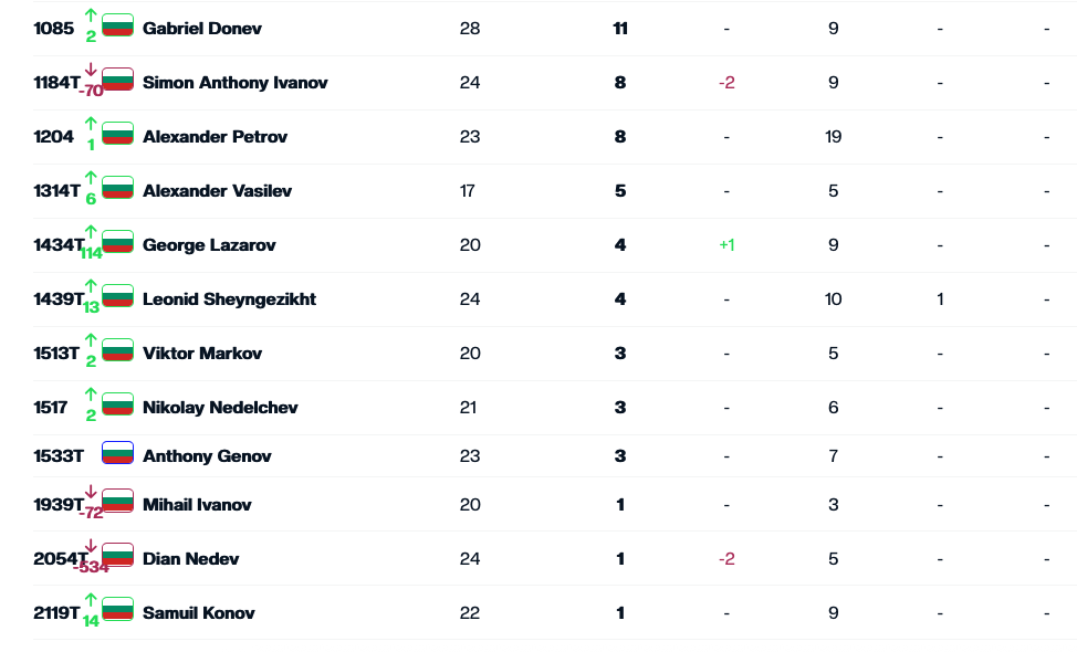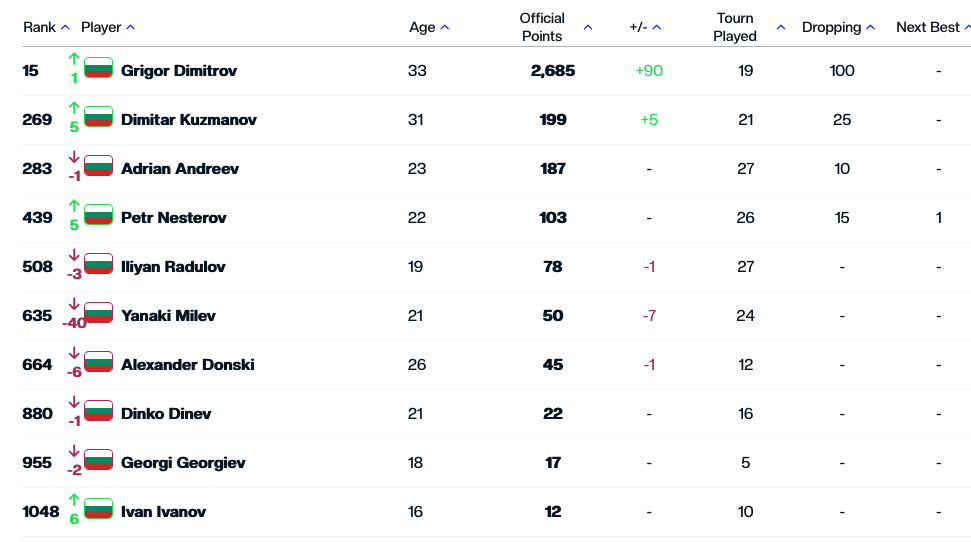 Втората ракета на България Димитър Кузманов се изкачи с пет места и вече е под №269 с актив от 199 точки. Адриан Андреев падна с една позиция до №283 със 187 точки, а Пьотр Нестеров прогресира с пет до №439 със 103 точки на сметката му.