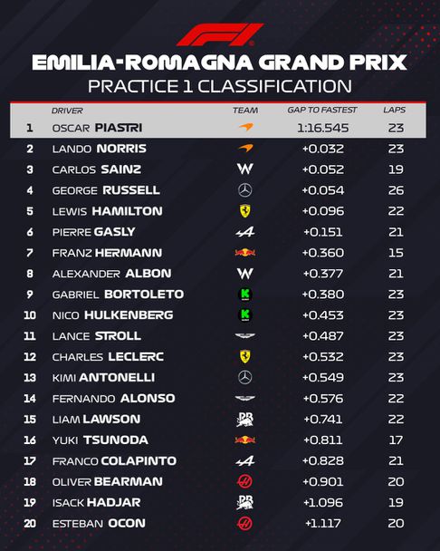 На „Имола“ лидерът в световния шампионат Пиастри стигна до 1:16.545, за да изпревари с 0.032 секунди своя съотборник Норис. Британецът обаче направи своя най-бърз тур във втората си летяща обиколка с меките гуми, които са от сместа С6, която прави своя дебют във Формула 1 този уикенд.