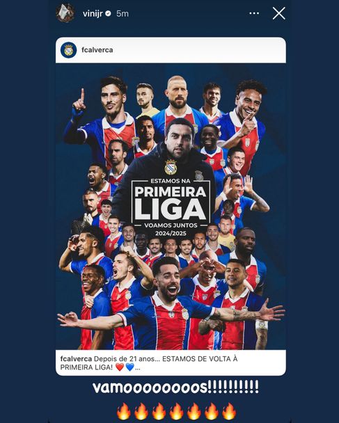 Винисиус Жуниор, бразилският нападател на Реал Мадрид, който е част от групата инвеститори в Алверка, сподели в социалните мрежи снимка, с която отбелязва промоцията.