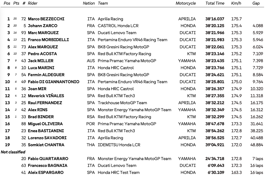 В генералното класиране в MotoGP след първите седем кръга за сезона лидер с актив от 196 точки е Марк Маркес, следван от Алекс Маркес със 172 и Франческо Баная със 124. Италианецът не завърши днес след падане в „Лъфийлд“.