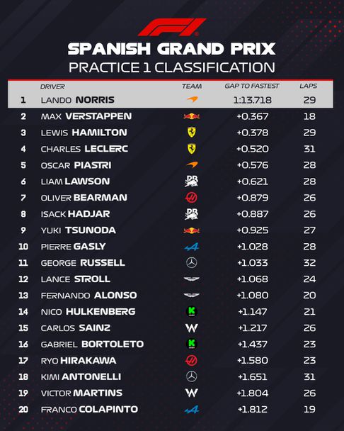 Тройката с пасив от 0.378 оформи Люис Хамилтън, чийто съотборник във Ферари Шарл Леклер се класира четвърти на 0.520 зад Норис. Лидерът в световния шампионат Оскар Пиастри завърши първата тренировка в Испания с пето време и пасив от 0.576 спрямо своя съотборник Норис.