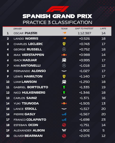 След като беше най-бърз във вчерашната втора свободна тренировка преди Гран При на Испания Оскар Пиастри оглави класирането и в края на третата подготвителна сесия на пистата „Каталуния“, при това с огромно предимство пред своя съотборник Ландо Норис.