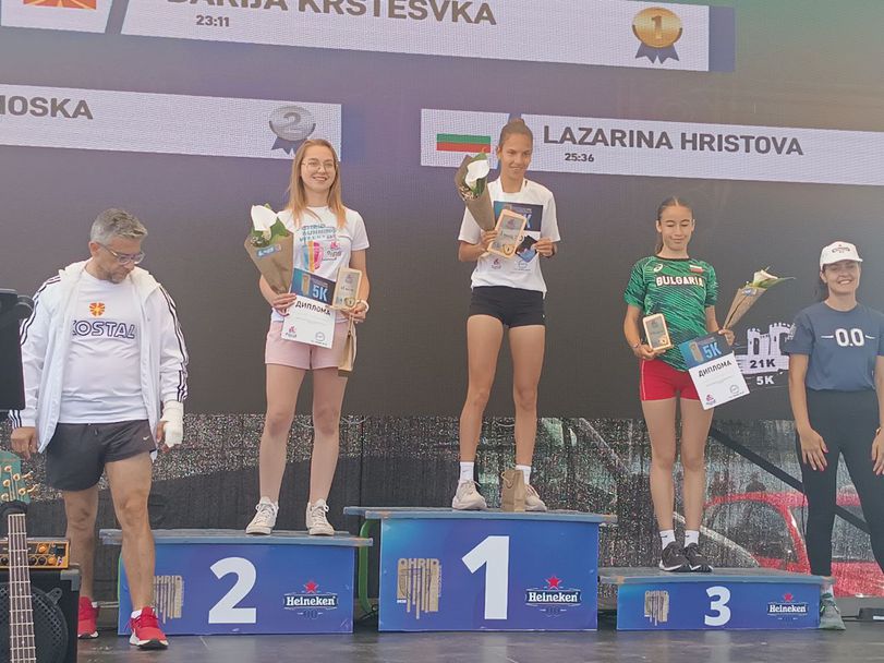 България имаше още един повод за радост, като в надпреварата на 5 км, където след отлично бягане младата ни надежда Лазарина Христова, възпитаничка на треньорката Елена Николаева от Нови пазар, се класира на трета позиция при жените с 25:37 мин. Шампионка стана македонката Дария Кръстевска с 23:12 мин, а на второ място – нейната сънародничка Емили Иваноска с 25:27 мин.