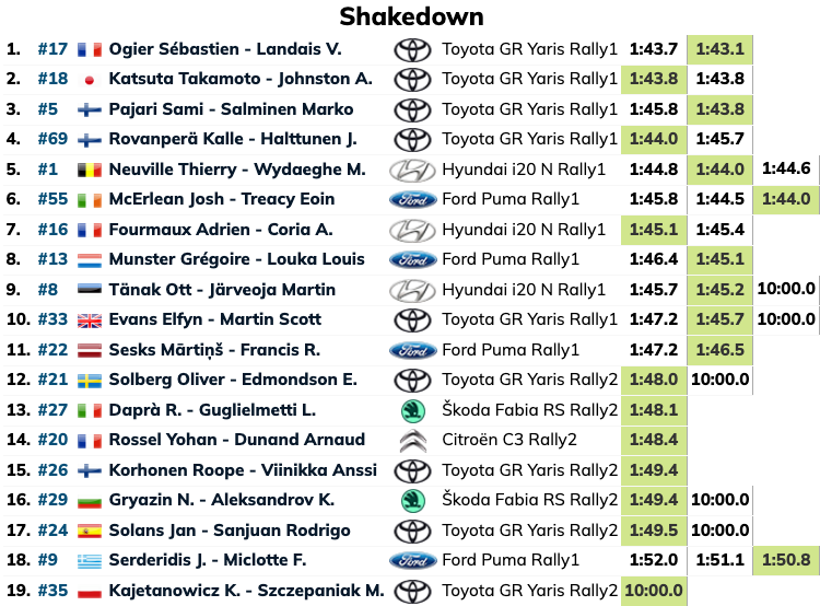 Трети и четвърти се класираха още двама пилоти на Тойота – Сами Паяри и Кале Рованпера, които изостанаха със съответно 0.7 и 0.9 от Ожие. Паяри записа най-доброто си време във второто си минаване, а Рованпера в първото. Равно време с финладеца даде и действащият световен шампион Тиери Нювил, който беше най-бърз извън пилотите на Тойота. Лидерът в генералното класиране Елфин Еванс, също с Тойота, остана едва десети, на 2.6 зад Ожие.