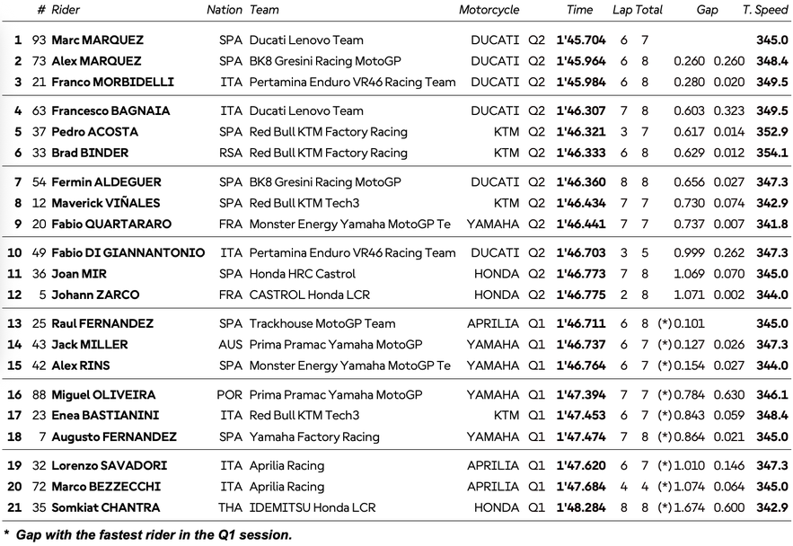 Компания на испанеца на петата редица ще правят Джак Милър и Алекс Ринс, а на шестия ред ще застанат Мигел Оливейра, Енеа Бастианини и участващият с „уайлд кард“ тестов пилот на Ямаха Аугусто Фернандес. На последната редица ще се наредят Лоренцо Савадори, победителят от Гран При на Обединеното кралство Марко Бедзеки и Сомкиат Чантра.