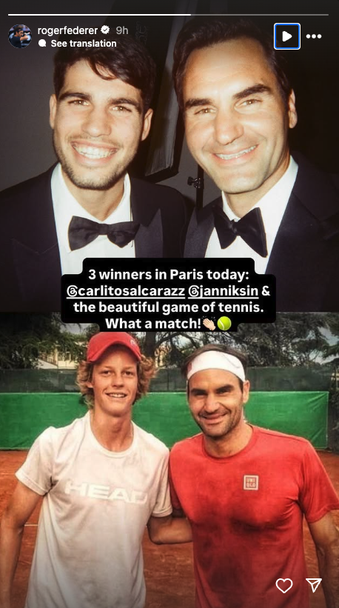 Федерер сподели снимка с Алкарас и Синер в Instagram с посланието: "Трима победители днес в Париж – Карлос Алкарас, Яник Синер и прекрасната игра тенис. Какъв мач!"