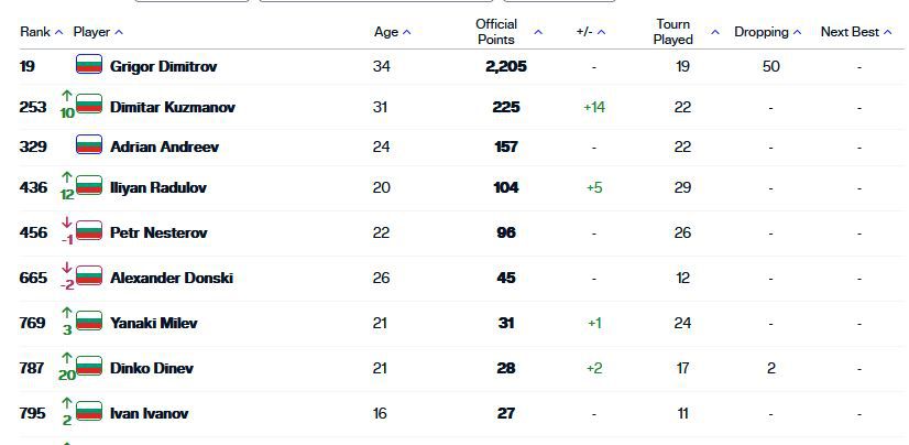 Втората ракета на България Димитър Кузманов отбеляза прогрес с 10 места и вече е №253 с 225 точки на сметката му. Адриан Андреев запази 329-ата си позиция със 157 точки, а Илиян Радулов записа ново рекордно класиране, изкачвайки се с 12 места до №436 с актив от 104 точки.