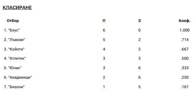 Това беше четвърти пореден успех за "койотите" и те продължават възхода си в класирането, където вече са трети, задминавайки "атлетите". На втора позиция остава "НСА-Лъвове", чийто тим през уикенда си размени по една домакинска победа с "Юнак" в столичното дерби.