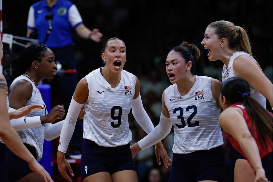 Страхотен мач за САЩ изигра Медисън Скинър, която заби 32 точки (2 блока) за победата. Сара Франклин добави още 20 точки (2 блока) за успеха.