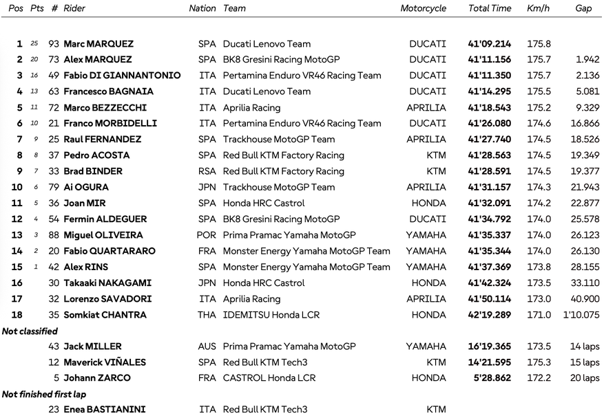 Баная, който преследваше своята четвърта поредна победа на „Муджело“, остана в подножието на подиума пред Марко Бедзеки, Франко Морбидели, Раул Фернандес, Педро Акоста, Брад Биндър и Ай Огура, които оформиха топ 10. Жоан Мир, Фермин Алдегер, Мигел Оливейра, Фабио Куартараро и Алекс Ринс допълниха зоната на точките в деветия кръг за сезона в MotoGP.