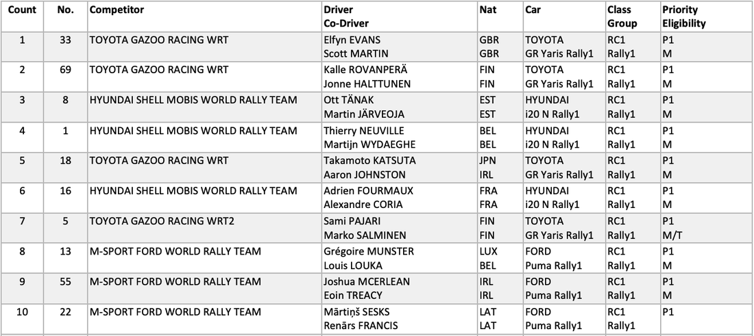 В него фигурират имената само на четиримата титулярни пилоти на Тойота – Елфин Еванс, Кале Рованпера, Такамото Кацута и новобранецът Сами Паяри, но не и това на Ожие, който и тази година кара с ограничена програма. Французинът стартира сезона с победа в Монте Карло, след което пропусна стартовете в Швеция и Кения преди да се завърне с второ място на Канарските острови. Последваха две поредни победи в Португалия и Сардиния, а за него сезонът ще продължи с рали „Акрополис“ тази седмица.