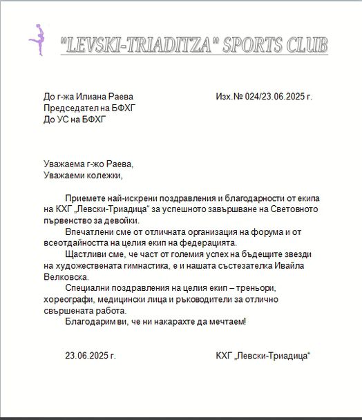 “Честито на БФХГ, треньорите и всички участвали състезателки за спечелените отличия!”, написаха от "Левски Триадица” във Фейсбук.