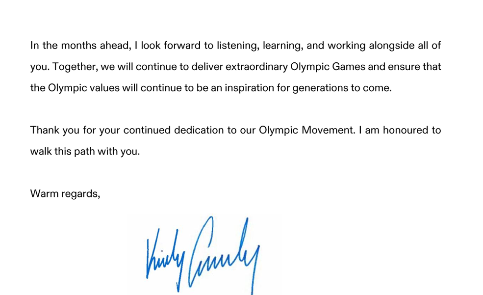 „През следващите месеци с нетърпение ще слушам, ще се уча и ще работя заедно с всички вас. Заедно ще продължим да провеждаме изключителни олимпийски игри и ще гарантираме, че олимпийските ценности ще продължат да бъдат вдъхновение за бъдещите поколения.