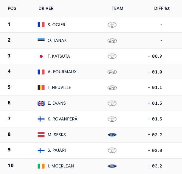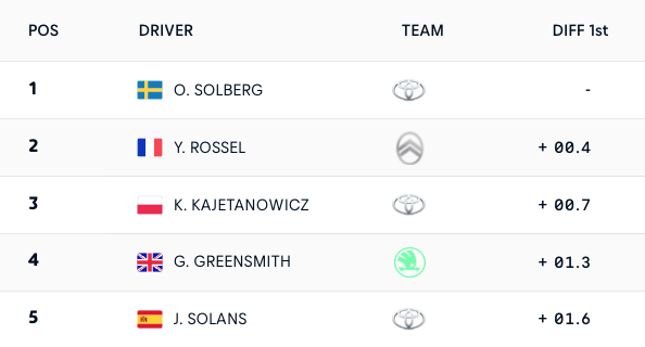 В WRC2 най-бърз с резултат от 1:21.6 беше Оливър Солберг, който си осигури аванс от 0.4 пред Йоан Росел. Тройката с изоставане от 0.7 спрямо шведа допълни Кайетан Кайетанович, който кара след Rally1 пилотите, когато отсечката беше малко по-чиста и беше отложен малко повече каучук по нея.