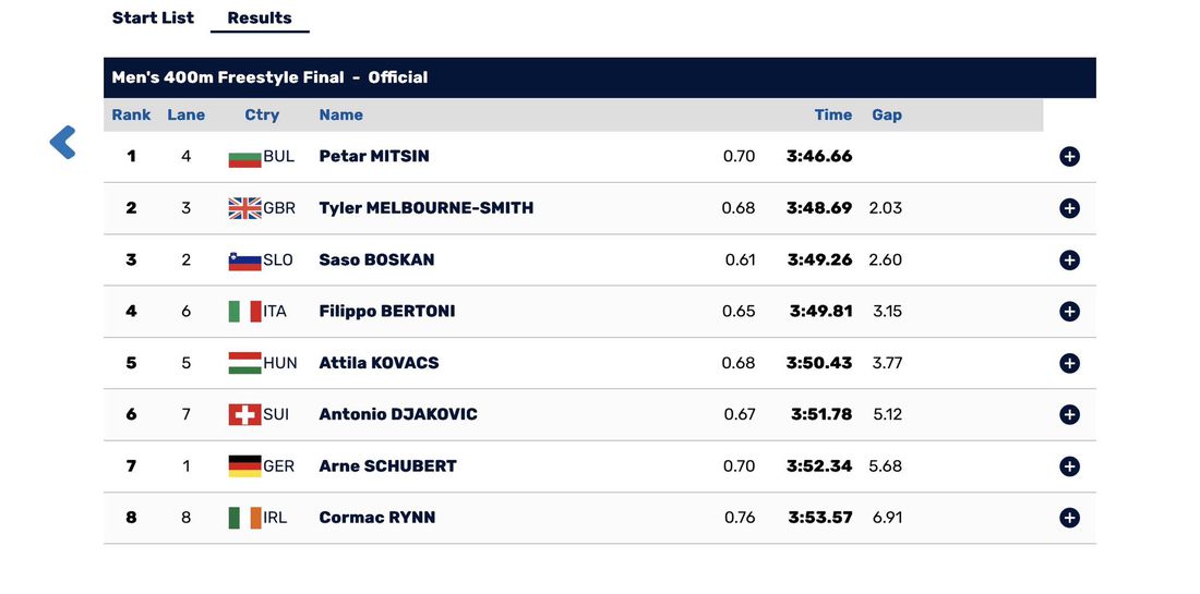 Това е втора титла за Петър Мицин в дисциплината от първенства за мъже до 23 години. През 2023г. роденият във Велинград плувец спечели златния медал и на шампионата в Дъблин, Република Ирландия.