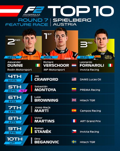 Ричърд Вершоор спечели своята трета победа за сезона във Формула 2, след като триумфира в основното състезание на пистата „Ред Бул Ринг“ и поведе в генералното класиране в шампионата.