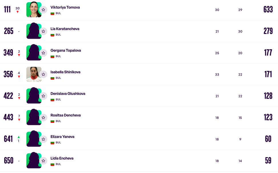 Няма промяна в позицията на Лия Каратанчева, която е 265-а с 279 точки. Гергана Топалова отстъпи с две места до №349 със 177 точки, а Изабелла Шиникова е под №356 (- 4 места) с актив от 171 точки.