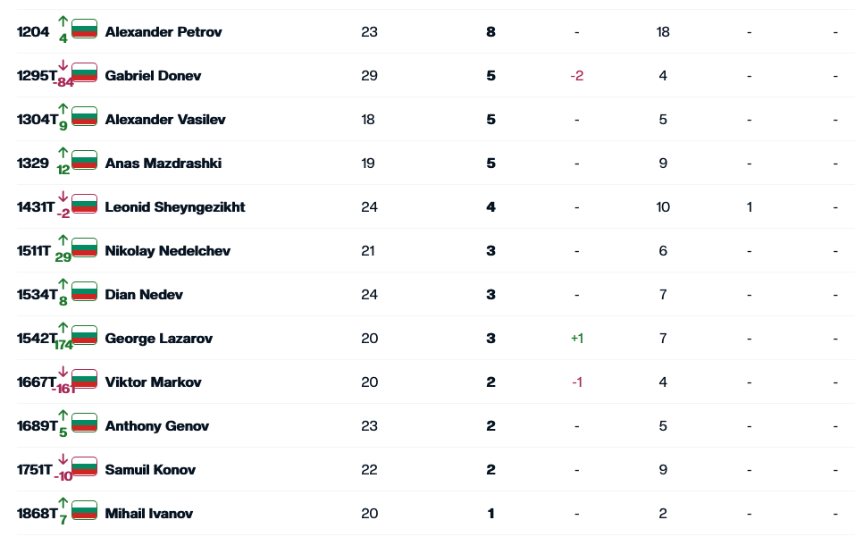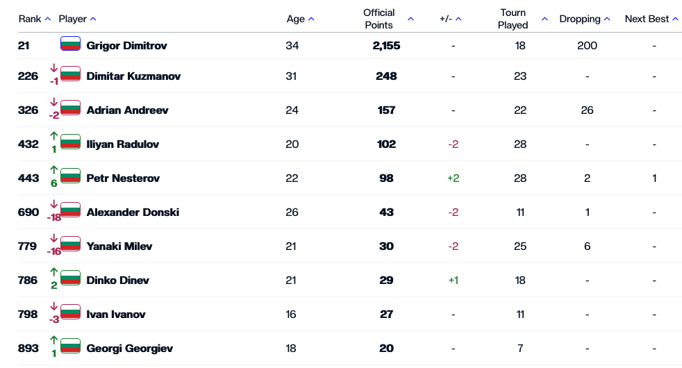 Втората ракета на България Димитър Кузманов е с актив от 248 пункта и заема 226-о място, а Адриан Андреев загуби две места и от днес е №326 със 157 точки. Ново рекордно класиране в кариерата си записа Илиян Радулов, който се изкачи с една позиция до №432 със 102 точки.