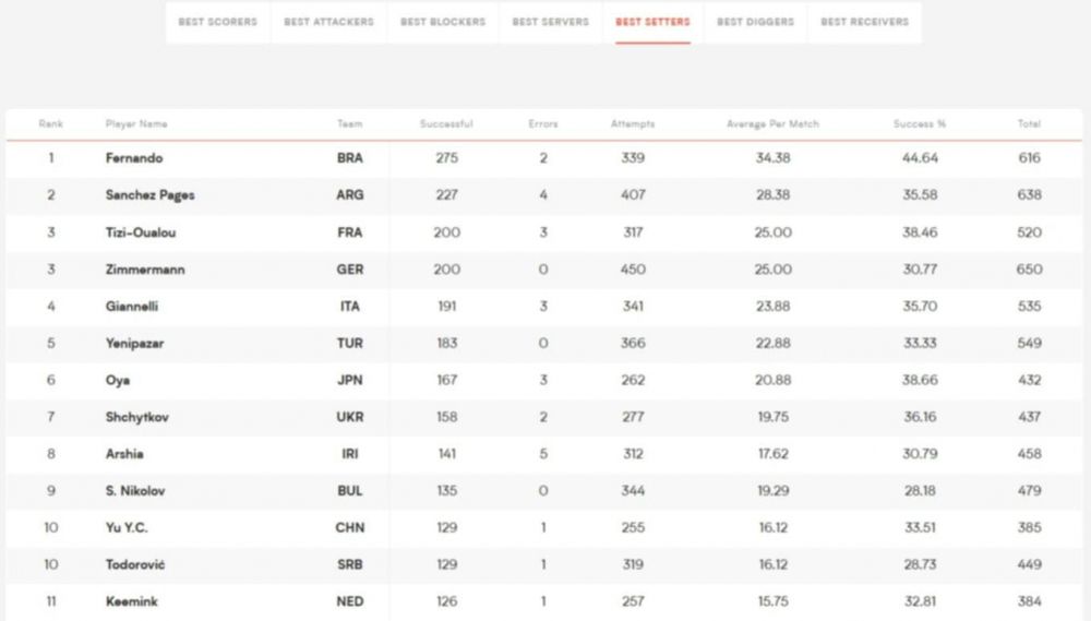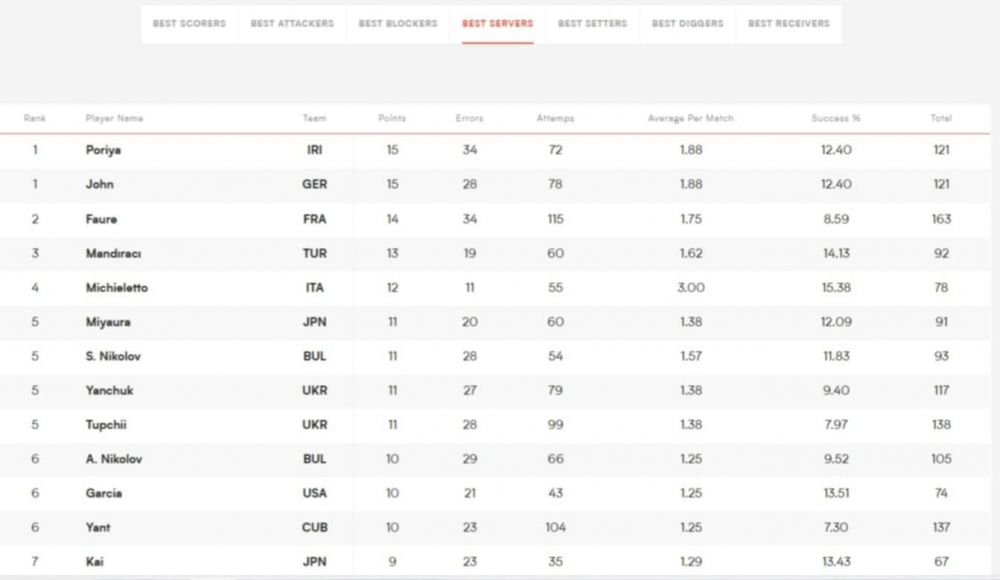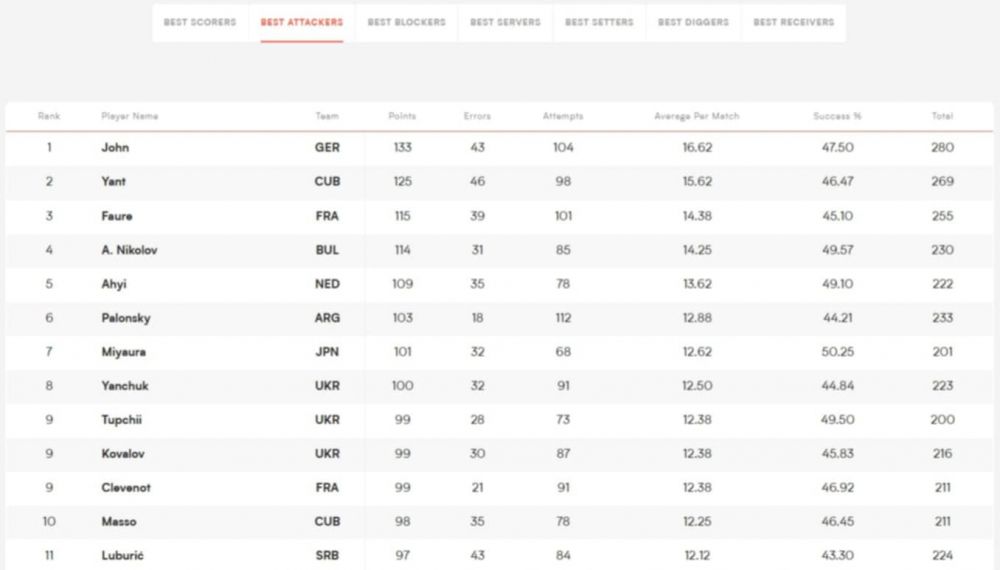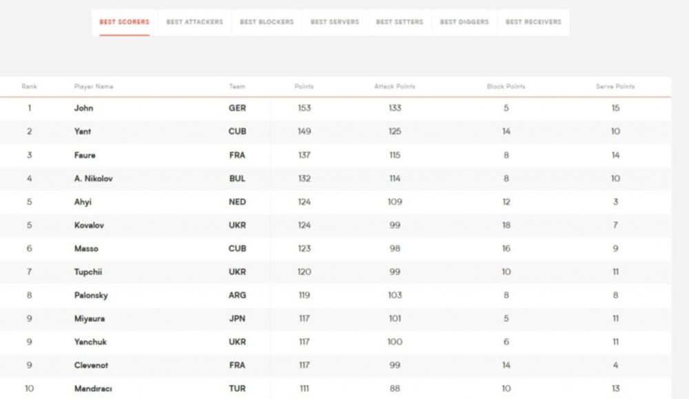 Лидер е германецът Филип Джон със 153 точки (5 аса, 15 блокади). Топ 3 се допълва от кубинеца Марлон Янт Ерера (149 точки) и французина Тео Форе (137 точки).