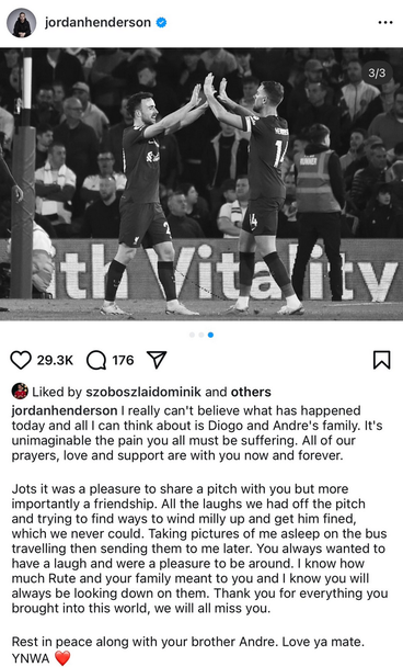Бившият капитан на Ливърпул Джордан Хендерсън също изрази своятa скръб за кончината на Диого Жота, с когото бяха съотборници на “Анфийлд”. Днес разплаканият халф се появи пред стадиона на “червените” и също постави цветя в памет на португалеца.