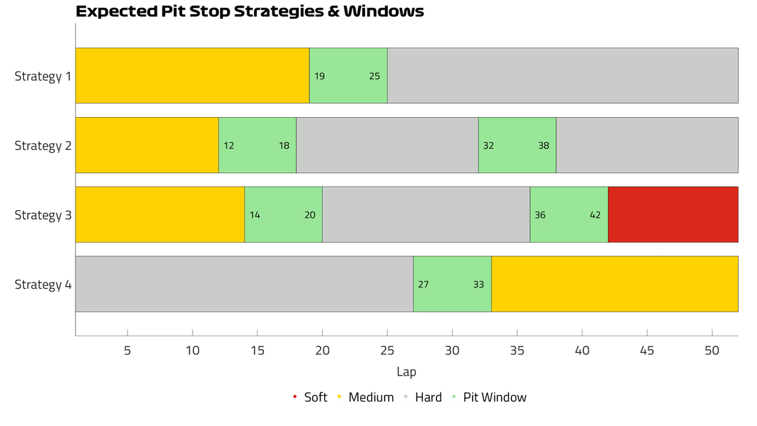 При тази стратегия се изисква старт със средно твърдата смес и преминаване към твърдата между обиколки 19 и 25. Алтернативно може да се заложи на по-дълга първа серия с твърдите гуми и преминаване към средно твърдите между обиколки 27 и 33. Разбира се, вариантът за по-агресивна стратегия с два бокса си остава, а тук възможностите са две – средно твърди, твърди и твърди гуми с прозорци за спиране 12-18 и 32-38 обиколка, или финален стинт с меките гуми и малко по-късни спирания в бокса.
