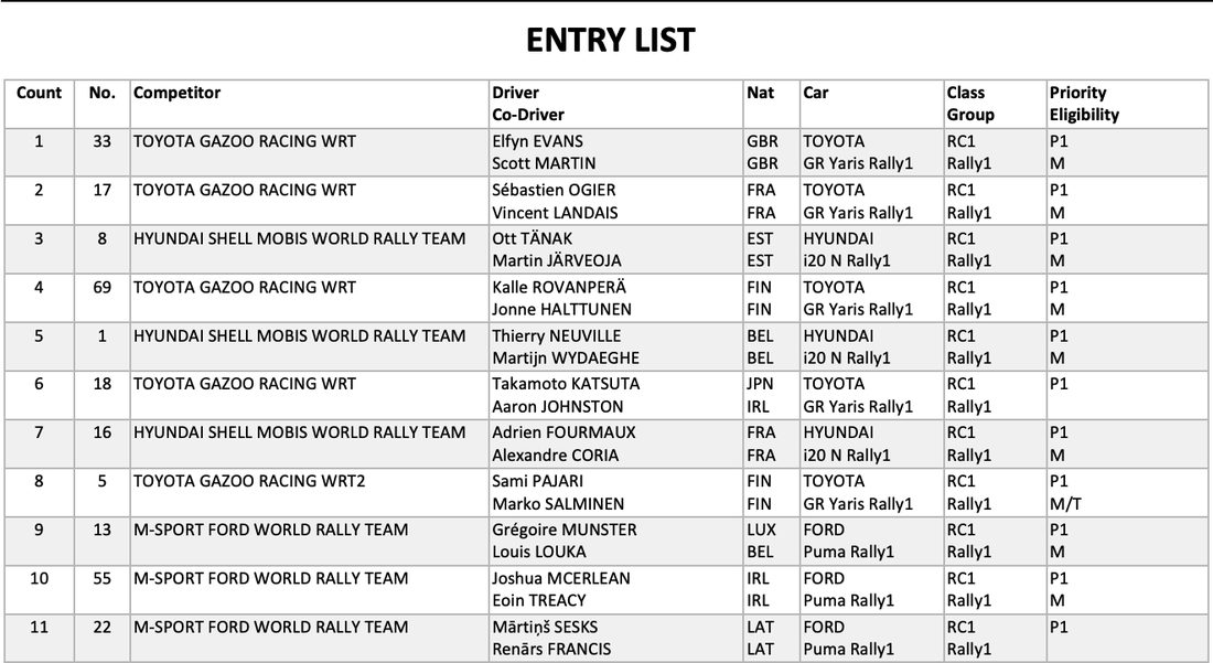 В Хюндай няма да има никакви промени в пилотския състав и отново ще видим Ойт Танак, Тиери Нювил и Адриен Фурмо с трите i20 N Rally1. В М-Спорт към титулярите Грегоар Мюнстер и Джошуа Макърлийн ще се присъедини латвиецът Мартинс Сескс, за когото това ще бъде шесто участие през сезона.