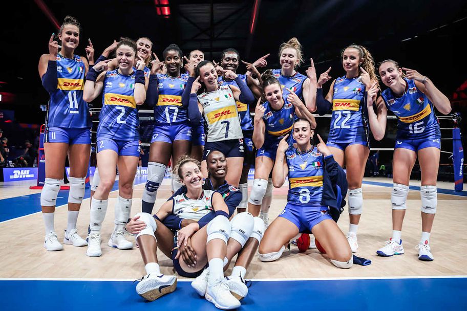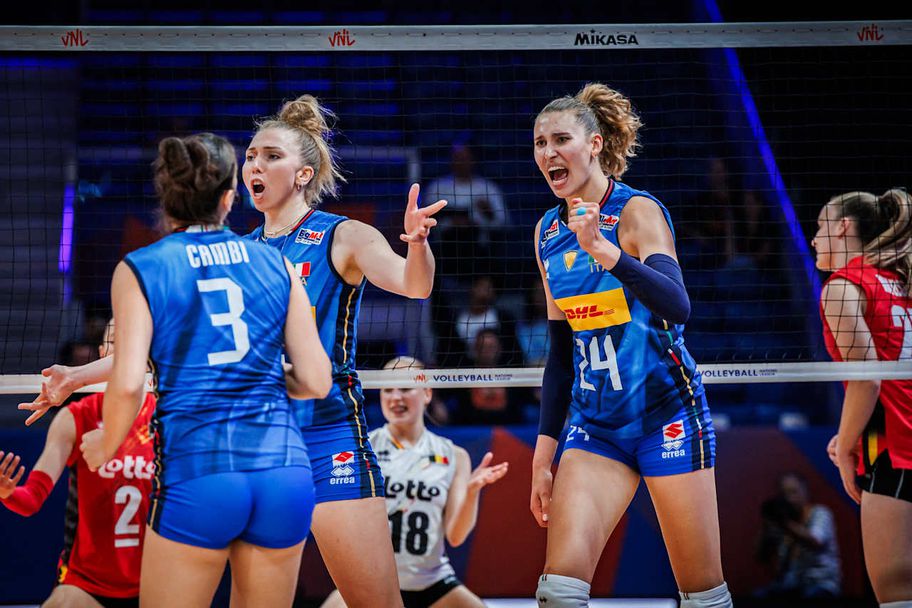 Олимпийският шампион Италия продължава да е единственият непобеден отбор в тазгодишното издание на Волейболната Лига на нациите за жени, след като постигна 9-а поредна победа. Момичетата на Хулио Веласко биха бързо и категорично Белгия с 3:0 (25:19, 25:15, 25:18) в първата си среща от турнира в Група 7 от последната седмица на основната фаза, играна пред само около 500 зрители в зала "Омниспорт" в Апелдоорн (Нидерландия).