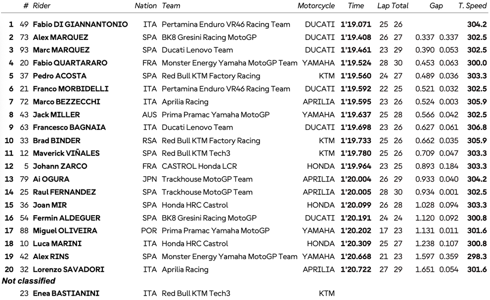 Зад тях трети остана големият фаворит този уикенд Марк Маркес, който завърши с пасив от 0.390 от Ди Джанантонио. Четвърти и пети се класираха Фабио Куартараро и Педро Акоста, а в топ 10 влязоха още Франко Морбидели, Марко Бедзеки, Джак Милър, Франческо Баная и Брад Биндър, които се класират директно за втората фаза на квалификацията утре.
