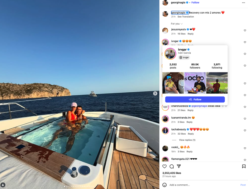 Тя не пропусна да сподели и фото, което разкрива как футболната суперзвезда тренира във фитнеса, дори по време на своята почивка. Двамата се наслаждават на времето си заедно на луксозна яхта, но не разкриват местоположението си.