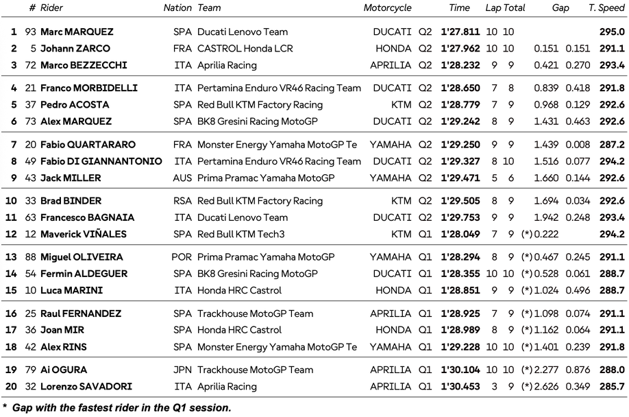 С този си тур Маркес изпревари с 0.151 секунди миналият през първата фаза Йоан Зарко, а заедно с тях на първата редица ще се нареди Марко Бедзеки, който беше с 0.421 по-бавен от Маркес. Франко Морбидели беше с рекордно време в края на втория сектор във финалната си обиколка, но падна в осмия завой, което го остави четвърти пред Педро Акоста и Алекс Маркес, които ще му правят компания на втория ред.
