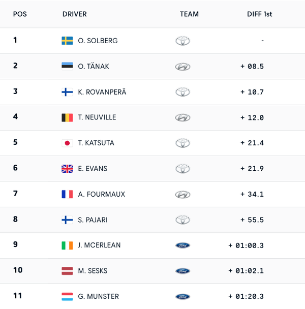 Зад него триото на М-Спорт Джошуа Макърлийн, Мартинс Сескс и Грегоар Мюнстер оформя дъното на класирането в Rally1 категорията. Тримата са събрани в рамките на 20 секунди, а Макърлийн изостава с 4.8 от Паяри, въпреки проблемите на пилота на Тойота.