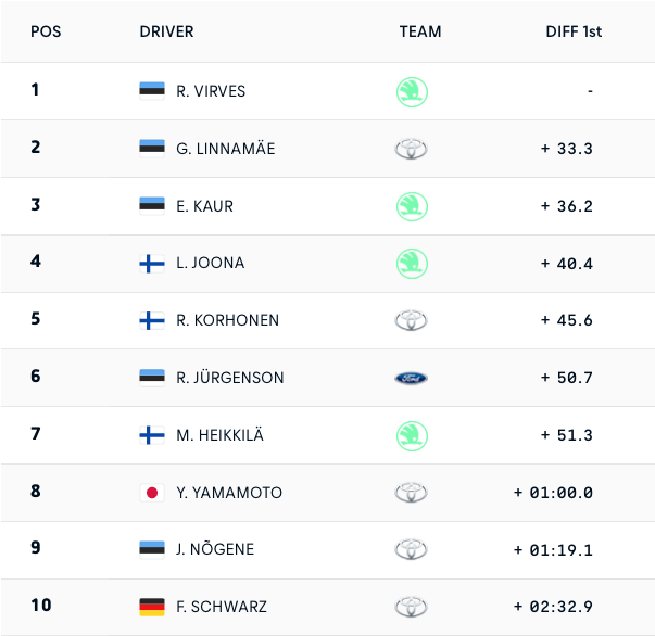 В WRC2 се заформи изцяло естонски трибой за първото място, в който предимството е на страната на Роберт Вирвес. Той води с цели 33.3 пред Гьорг Линамае, а тройката с пасив от 36.2 спрямо лидера оформя Егон Каур. Лаури Йоона е първи след тримата естонци, като финландецът изостава с 4.2 от Каур и води с 5.2 пред своя сънародник Роопе Корхонен.