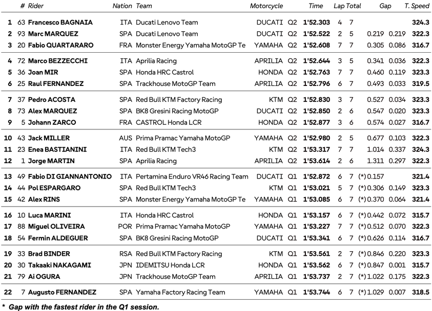 До двамата пилоти на Дукати на първата редица ще се нареди Фабио Куартараро, който изостана с 0.305 от Баная. Зад тях от втория ред ще потеглят Марко Бедзеки, Жоан Мир и Раул Фернандес, а Педро Акоста, Алекс Маркес и Йоан Зарко ще разделят третия ред. Най-бавни във втората фаза на квалификацията бяха Джак Милър, Енеа Бастианини и завръщащият се световен шампион Хорхе Мартин, които ще застанат на четвъртата редица.