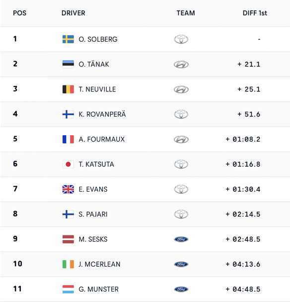 Такамото Кацута се движи на 8.6 зад френския пилот на Хюндай, а зад японеца топ 10 оформят лидерът в генералното класиране Елфин Еванс, Сами Паяри, Мартинс Сескс и Джошуа Макърлийн. Ирландецът има предимство от 34.9 пред съотборника си Грегоар Мюнстер в битката за последната точка.